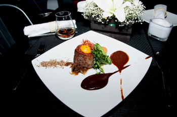 Como entrada se ofreció un taco de tortilla de coco, con atún, aguacate, aderezo de miel virgen de caña y espuma de calabaza, además de una tierra de setas y hongos que parecían el petate tradicional que adorna las botellas de Zacapa, como plato fuerte deleitaron a los asistentes con un filete de Res, con tres Salsas: Chocolate, ciruela y Piña, con puré de camote el cual nos recordaba la mezcla de cada una de las barricas en Ron Zacapa.